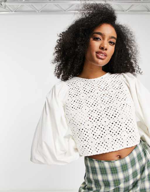 ASOS DESIGN long sleeve top with patchwork crochet detail and tassel tie in white Very well made.